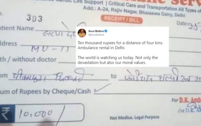 টুইটে তিনি জানিয়েছেন, প্রীতমপুরা থেকে ফর্টিস হাসপাতালের দূরত্ব মাত্র ৪ কিলোমিটার, কিন্তু ওইটুকু পথ যেতেই ডিকে অ্যাম্বুল্যান্স সার্ভিস ভাড়া নিয়েছে ১০ হাজার টাকার! অরুণ বোথরা লিখেছেন, সারা বিশ্ব এখন আমাদের দেখছে, মানুষ কতটা অমানবিক হতে পারে!