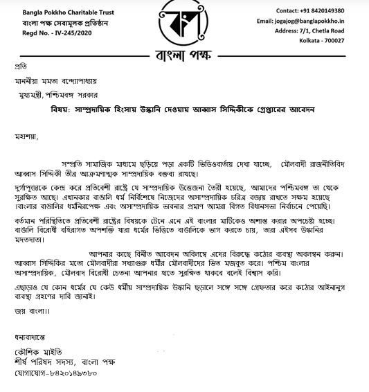 চিঠিতে বাংলা পক্ষ লিখেছে, ‘সম্প্রতি সামাজিক মাধ্যমে ছড়িয়ে পড়া একটি ভিডিও বার্তায় দেখা যাচ্ছে, মৌলবাদী রাজনীতিবিদ আব্বাস সিদ্দিকি তীব্র আক্রমণাত্মক সাম্প্রদায়িক বক্তব্য রাখছেন। দুর্গাপুজোকে কেন্দ্র করে প্রতিবেশী রাষ্ট্রে যে সাম্প্রদায়িক উত্তেজনা তৈরি হয়েছে, আমাদের পশ্চিমবঙ্গ তা থেকে সুরক্ষিত আছে। এখানকার বাঙালি নিজেদের অসাম্প্রদায়িক চরিত্র বজায় রাখতে সক্ষম হয়েছে ধর্ম নির্বিশেষে। বিগত বিধানসভা নির্বাচনে তার প্রমাণ আমরা পেয়েছি। বর্তমান পরিস্থিতিতে প্রতিবেশী রাষ্ট্রের বিষয়কে টেনে এনে এই বাংলার মাটিকেও অশান্ত করার অপচেষ্টা হচ্ছে। বাঙালি বিরোধী বহিরাগত অপশক্তি যারা ধর্মের ভিত্তিতে বাঙালিকে ভাগ করতে চায়, তারা এইসব উস্কানির মদতদাতা।’