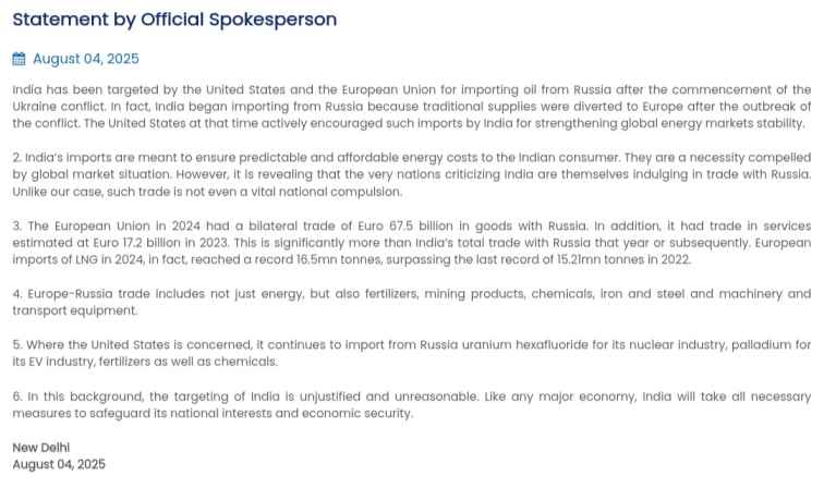 ৬. এই প্রেক্ষাপটে ভারতের প্রতি এমন টার্গেটেড সমালোচনা সম্পূর্ণ অন্যায্য ও অযৌক্তিক। বিশ্বের যেকোনো বড় অর্থনীতির মতো, ভারতও জাতীয় স্বার্থ ও অর্থনৈতিক নিরাপত্তা রক্ষার্থে প্রয়োজনীয় সব পদক্ষেপ নেবে।