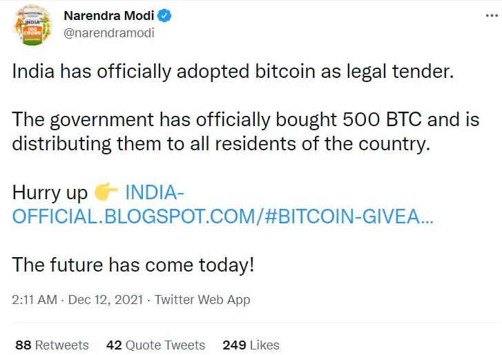 জানা গেছে, শনিবার রাত ২ টা ১১ মিনিটে মোদীর টুইটার থেকে বিটকয়েন সম্পর্কিত একটি টুইট করা হয়। ওই টুইটে লেখা হয়েছিল, ভারতে বৈধতা পেল বিটকয়েন। ভারত সরকার ৫০০টি বিটকয়েন কিনছে এবং সেগুলি দেশের জনগণের মধ্যে ফ্রিতে বিতরণ করছে।